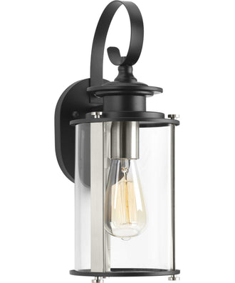 The Squire 1-Light Small Wall Lantern in Matte Black is a perfect blend of classic traditional charm and modern sophistication. Its sleek, cylindrical frame is crafted from durable steel and features a matte black finish that is both elegant and versatile. The lantern is accented with contrasting stainless steel metallic elements that add a touch of contemporary flair. The clear glass diffuser enhances the overall aesthetic, allowing the light to shine brilliantly and create a welcoming ambiance.