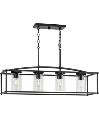 An airy frame and clear glass shades deliver unobstructed layers of light to outdoor rooms. Strong geometric lines and an open cage frame create the ideal light for transitional and farmhouse settings. A classic matte black finish showcases the clean lines of the fixture's frame. The arched top of the frame adds a graceful dimension to the design. Crisp, clear glass shades are closed on top to protect the elegant candelabra lights from the elements. Measures 36 in. L x 10.87 in. W. x 11 in. H. Uses (4) 60-Watt maximum medium base bulbs, or LED equivalent, that are sold separately. Dimmable when used in conjunction with dimmable bulbs. Certifications: cETLus Damp Location listed, fixture can be used in covered outdoor areas. Warranty: Our 1-Year Limited Warranty guarantees your complete satisfaction with your purchase and includes professional after-sales customer service support. Includes installation instructions and mounting hardware for a quick, easy installation