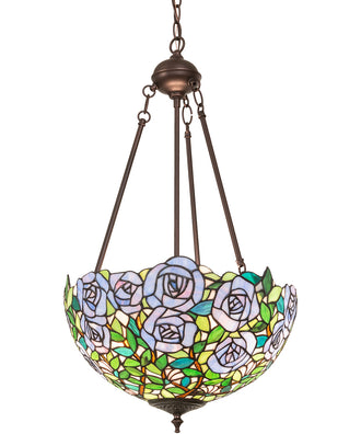 This inverted pendant light showcases a captivating design with its bowl-shaped shade adorned with delicate rose motifs. The vibrant colors of the roses and leaves are beautifully rendered in stained glass, creating a mesmerizing effect when illuminated. The Mahogany Bronze finish adds a touch of sophistication and complements the intricate glasswork, making this pendant light a timeless addition to any decor.