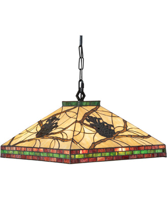 The 17" Square Pinecone Mission Pendant is an exquisite piece of lighting that brings a touch of nature-inspired elegance to any space. The design features the iconic pinecone, one of Mother Nature's most compelling organic symbols, which offers natural elegance and represents the evolution of human enlightenment. The pendant showcases a stunning stained glass shade with a woodland-themed Mission shape, highlighting light brown art glass pinecones and golden sun branches on a beige art glass background. Burgundy and leaf green bands edge the shade, adding a vibrant touch to the overall design.
