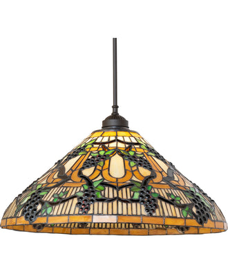 Bring sunny vineyards to your home or business with this lovely Meyda Original pendant. Radiant Concord Purple jewels; Vineyard Green leaves; and glistening dew-kissed Bark Brown vines wrap around a Golden Sunshine banded shade. The art glass shade is created using the famous Meyda Tiffany copperfoil construction process. The fixture is enhanced with an Oil Rubbed Bronze finish. The overall height can be adjusted by combining the four stem lengths included: 9-inch; 15-inch; 19-inch; and 27-inch in any combination to achieve the desired drop from the ceiling. The Jeweled Grape Pendant is featured in our American-designed; handcrafted Stained Glass Collection. UL and cUL listed for dry and damp locations. Each shade is a unique work of art with color variations based on natural ingredients inherent in the glass.