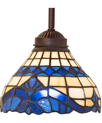 Regal scrolls and flourishes of Wedgewood Blue; with coordinating diamond accents on a Beige gridwork art glass background; adorn this exquisite Tiffany-styled shade. This beautiful pendant features an art glass shade created using the famous Meyda Tiffany copperfoil construction process and complemented with elegant floral-style stamped metal hardware in a Mahogany Bronze finish. The overall height ranges from 16 to 68 inches as the suspension rod adjusts and assembles in the field using four included tube lengths in Mahogany Bronze finish. To create a dramatic design statement; install these mini pendants in groups to illuminate bars; counters; and kitchen islands in residential; commercial; and hospitality settings from Boston; Massachusetts; to Savannah; Georgia; to Monterey; California. The Baroque Wall Sconce is included in our American-designed; handcrafted Tiffany Stained Glass Collection. UL and cUL listed for dry and damp locations. Each shade is a unique work of art with color variations based on natural ingredients inherent in the glass.