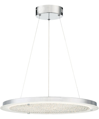 The Blaze Pendant features a unique design that combines modern aesthetics with timeless elegance. The pendant's circular shape is adorned with clear glass crystals that appear to "float" on a disk of glass, creating a mesmerizing effect. The glass is frosted on the perimeter, enhancing the striking design and adding a touch of sophistication. The polished chrome finish complements the overall look, making it a versatile piece that can blend seamlessly with various interior styles.