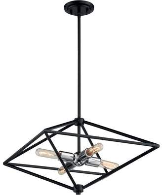 Introducing the 19"W Legend 4-Light Pendant in Black and Polished Nickel by Nuvo Lighting, a stunning addition to any modern or contemporary space. This pendant light features a geometric design with a sleek black and polished nickel finish, adding a touch of sophistication and elegance to your home or office. The open frame design showcases the bulbs, creating a striking visual effect that enhances the overall aesthetic of the room.