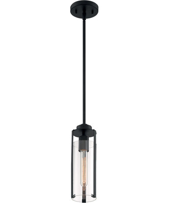 The 5"W Marina 1-Light Pendant in Matte Black is a stunning addition to any home or office decor. This mini pendant fixture from Nuvo Lighting features a sleek, modern design that effortlessly blends style and functionality. The fixture's matte black finish provides a sophisticated touch, while the clear cylinder glass shade allows for an unobstructed view of the bulb, creating a striking visual effect. The combination of steel and glass materials ensures durability and a timeless appeal that complements various interior styles, from contemporary to industrial.