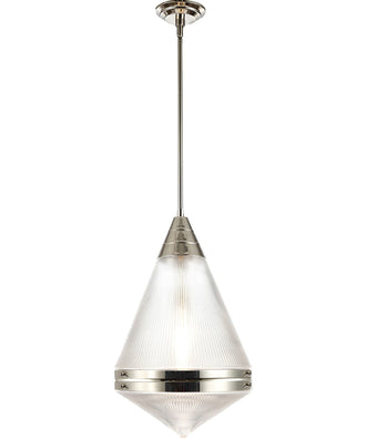 A prismatic diffusion of light is housed within pressed cone glass shades. Choose from pendants with tapered metal halves that conceal the light source or glass shades that are supported by a metal ring. Coordinating bath vanity lights complete the collection.