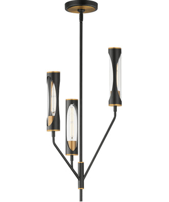 The Regent 3-Light Pendant boasts a sophisticated design with a layered composition of materials. The tubular lamps are encased within clear glass tubes, which are further sheathed in metal shades. These shades feature elegant oval cut-outs that reveal the light source, adding an element of intrigue and sophistication. The chandelier arms extend in elongated, uneven heights, creating a dynamic and eye-catching silhouette.