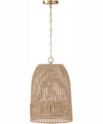 The Naomi 1-Light Pendant in Matte Brass is a stunning blend of natural materials and contemporary design. The pendant features a hand-woven rattan shade that exudes a casual yet chic aesthetic. The natural tan finish of the rattan provides a warm, inviting glow, perfect for creating a cozy ambiance in any room. Complementing the rattan is the matte brass metal accents that add a touch of elegance and sophistication. The slightly shiny matte finish of the brass is smooth to the touch, enhancing the overall luxurious feel of the fixture.