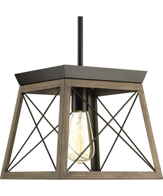 The Briarwood collection features a classic pattern commonly found on barn or farmhouse doors and gates. The simple geometric form features a faux-painted wood enclosure to frame vintage-style light bulbs. A rich Oak and Antique Bronze finish combination. One-Light mini-pendant.