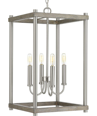 With updated designs that honor the charm of early American styling, Fontayne four-light pendant provides a timeless elegance to Rustic Farmhouse, Modern Farmhouse and Urban Industrial spaces. Impressive graphic elements take center stage, while candelabra lights highlight subtle curves. Dual tone finish combinations of Brushed Nickel with weathered gray accents.