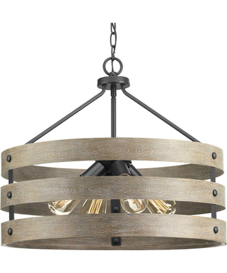 Three circular bands wrap together to create an open design in Gulliver. Hand painted to emulate weathered driftwood, the four-light pendant's Graphite frame is accented by smooth knobs and encases exposed bulbs. The wood grained texture complements rustic farmhouse home decor.