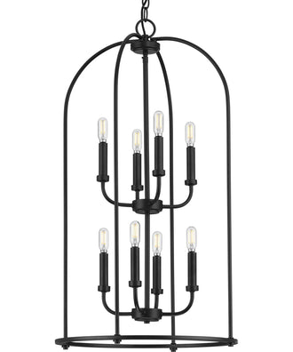 Introducing the Leyden 8-Light Farmhouse Style Foyer Pendant Light in Matte Black, a stunning addition to any home decor. This pendant light features an open-frame design that exudes elegance and sophistication. The candlestick light bases are meticulously crafted and coated in a beautiful matte black finish, offering a timeless appeal that complements various interior styles. The smooth light bases provide a graceful illumination that enhances the ambiance of any room.