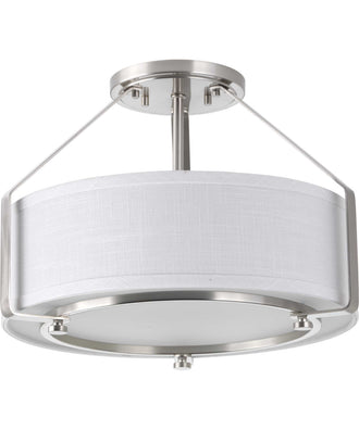 The Ratio 3-Light 16" Semi-Flush Mount in Brushed Nickel is a perfect blend of modern elegance and functional design. This light fixture features a sleek metal frame that supports a low-slung shade, creating a casual yet sophisticated style. The white linen drum shade complements the brushed nickel finish, adding a touch of contemporary charm to any room. The polished glass exterior and etched glass interior diffuser enhance the fixture's aesthetic appeal while ensuring easy maintenance.