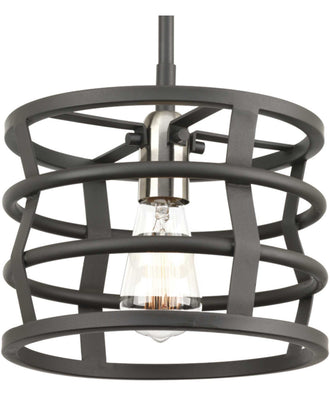 The Remix 1-Light Global Pendant Light in Graphite is a stunning addition to any space, combining industrial inspiration with modern elegance. This pendant light features a unique open cage design created by intertwining graphite-finished steel straps. The brushed nickel accents inside the cage add a touch of mixed metal sophistication, making it a versatile piece that complements various decor styles.