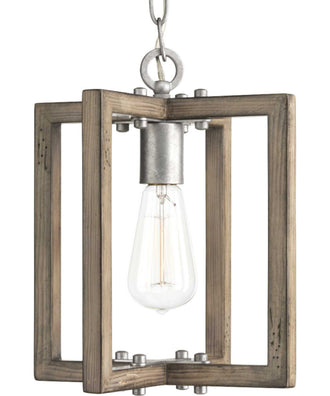 The pendant light boasts a galvanized finish in a sophisticated grey hue, which perfectly complements the distressed wood frame. This combination of finishes not only enhances the visual appeal of the light but also ensures it blends effortlessly with various color schemes and interior designs.