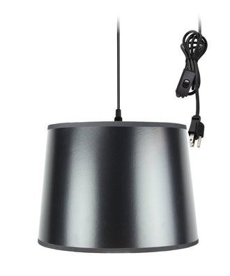 The 14" W 1 Light Swag Plug-In Pendant is a sophisticated addition to any home, featuring a sleek black and gold shade that exudes modern elegance. The pendant's drum-shaped shade has a top diameter of 12 inches, a bottom diameter of 14 inches, and a slant height of 10 inches, making it a perfect size for various spaces. The exterior boasts a rich black finish, while the interior is lined with a luxurious gold parchment, creating a warm and inviting glow when illuminated. The design is complemented by a durable 17-foot black cord, allowing for flexible placement and easy installation.