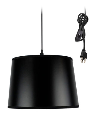 The 12" Wide 1 Light Swag Plug-In Pendant with a Shallow Drum Black Shade and Black Cord is a stylish and functional addition to any home. Its sleek, contemporary design features a shallow drum shade in a sophisticated black finish that complements a variety of interior styles, from modern to industrial. The shade measures 10" at the top, 12" at the bottom, and has an 8" slant height, providing a balanced and elegant look.