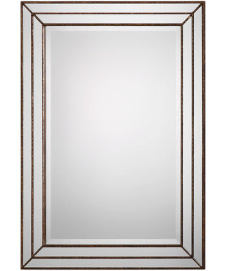 This frame features mirror inlays, separated by thin, grooved framing strips, finished in a metallic bronze. The center mirror has a 1" bevel. This frame may be hung either vertically or horizontally. Also available in silver, W00404.