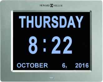 This clock is designed to help people suffering from memory loss or dementia, poor or impaired eyesight, or those who have a hard time comprehending abbreviated words by displaying the time and clearly spelling out the full day of the week, month and date in large, bold letters. A second display option simply shows the day of week and period of the day morning, afternoon, evening or night. Features a non-glare, 8" LED backlit display that automatically adjusts display brightness in day and night mode. Time display can be set to 12- or 24-hour format and has eight different language options: English, Spanish, French, German, Italian, Polish, Dutch or Welsh. Clock may be wall mounted or displayed on a table top by using the built-in foldable easel stand. The injection molded case is finished in satin silver on the front and black on the back. AC powered time only; includes UL listed AC power adapter. Height 6.75" (17 cm) Width 8.5" (22 cm) Depth 1" (3 cm)
