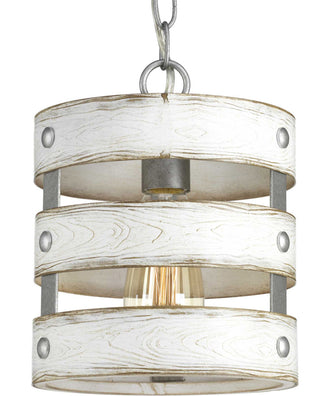 The pendant light boasts a galvanized finish complemented by hand-painted antique white accents. This combination not only adds visual interest but also ensures the fixture blends seamlessly with various decor styles. The embossed wood grain pattern on the metal banding provides a rich texture that elevates the overall aesthetic of the light.