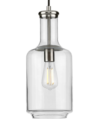 A round ceiling plate coated in a brushed nickel finish anchors the pendant in place as the light source hangs below. A bottle-inspired clear glass shade adds a twist to a simple industrial style that brings this light fixture's vintage charm to the forefront of your home's lighting design. Introduce a pop of personality into your home with this pendant. Ideal for any foyer, kitchen, or dining room. Perfect for transitional, farmhouse, or coastal settings. Measures 7-inch width by 17-inch height. Uses one medium base bulb that is sold separately (60w max - LED or incandescent). Able to be fully dimmable with dimmable bulbs. Includes installation instructions and mounting hardware. Progress Lighting products are designed for exceptional quality, reliability, and functionality.