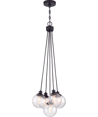 The Que 5-Light Pendant boasts a unique design that combines industrial elements with a modern aesthetic. The clear seeded glass globes are arranged in a cluster, providing a fresh and updated look that will enhance any room's decor. The pendant's flat black finish complements the seeded glass, creating a harmonious blend of textures and colors that is sure to impress. The sleek lines and minimalist design make this pendant a versatile choice for various interior styles, from modern to industrial to transitional.