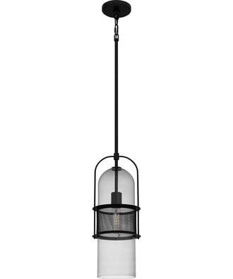 The Quoizel Piccolo Pendant Small 1-light Mini Pendant in Matte Black is a striking blend of modern and industrial design. Its streamlined silhouette features a clear glass shade that elegantly encases an exposed bulb socket. The addition of a metal mesh band enhances its industrial appeal, making it a versatile piece that complements a variety of interior styles.