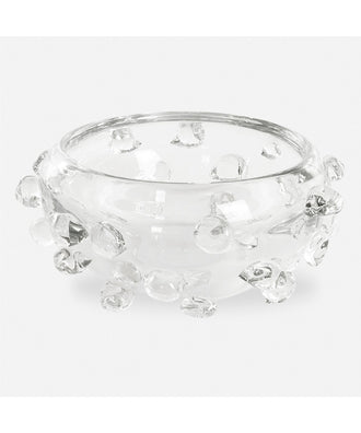 Enhance your home decor with our thick clear glass bowl, adorned with organic glass spheres accenting the surface. this stunning piece combines modern sophistication with artistic flair, making it the perfect addition to any room.