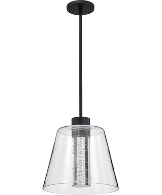 A fusion of contemporary style and classic allure, the exquisite Aura 62-2172 LED medium pendant is elegantly crafted for today's style. A dance of light awaits with integrated LED shining through a K9 bubble crystal column, inviting you to enjoy its warmth and glow through the clear glass shade. Featuring the latest in LED technology, the fixture comes in 3000K soft white light. The sleek matte black finish effortlessly compliments the clear glass shade, and is versatile, working well with existing finishes, and decor. Picture your space transformed with beautiful simplicity, the latest technology, and design that is a celebration of here and now with Aura.