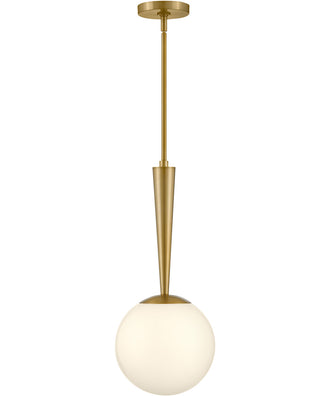 The Izzy 1-Light Small Pendant in Lacquered Brass is a stunning example of modern lighting design. This pendant light features a sleek, tapered structure that effortlessly combines elegance and simplicity. The long, slender lines of the brass fixture are perfectly balanced by the shapely, cased opal globe, creating an intriguing silhouette that captivates the eye. The lacquered brass finish adds a touch of sophistication and warmth to any space, making it a versatile addition to various interior styles.