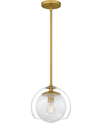 The Quoizel Piccolo Pendant Small 1-light Mini Pendant in Brushed Gold is a striking addition to any contemporary space. Its design features a captivating combination of clear glass with an inner cloud glass orb, creating a unique visual effect that draws the eye. The brushed gold finish adds a touch of sophistication and elegance, making it a perfect fit for modern and transitional decor styles.