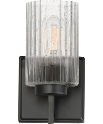 Clear Ribbed glass cylinders are supported on gracefully sweeping frames. The glass pattern helps to diffuse the light source while adding texture and style to the design. Available in Polished Nickel, Satin Champagne, or Matte Black.
