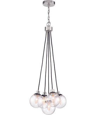 Introducing the Que 5-Light Pendant in Chrome, a stunning piece from the Craftmade collection that promises to elevate the aesthetic of any room. This pendant light features a striking silhouette with five clear seeded glass globes that hang gracefully from a chrome-finished base. The modern design is both elegant and sophisticated, making it an ideal addition to contemporary and transitional spaces alike.
