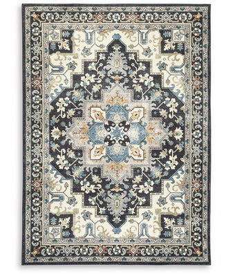 • Machine woven, printed medallion design in shades of black, cream, blue, teal, gray, rust and ocher