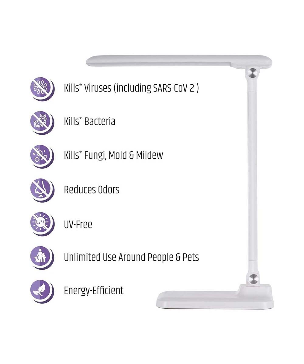 • FEATURES - Innovative desk lamp proven to kill germs illuminates while it cleans. UV-free. Shines with patented Vyv antimicrobial leds. Won't damage skin, eyes or surfaces. Proven to kill and prevent the growth of 28 different bacteria, mold, mildew, fungi, viruses. Fully adjustable lamp head tilts, pivots, folds down, wireless Qi Mobile device charging, 1-touch cleaning activation. Only antimicrobial lighting scientifically proven to kill viruses. 10 plus years lifespan, 2-year warranty. Dimmable light. Can be adjusted to different levels of brightness to create your desired ambiance.