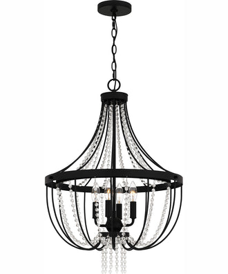 The Adelaide 4-light Pendant in Matte Black is a stunning addition to any home, combining modern elegance with a touch of French country charm. The pendant's design features a harmonious blend of matte black steel and sparkling crystal accents, creating a striking contrast that captures attention and adds a touch of sophistication to any room.