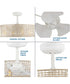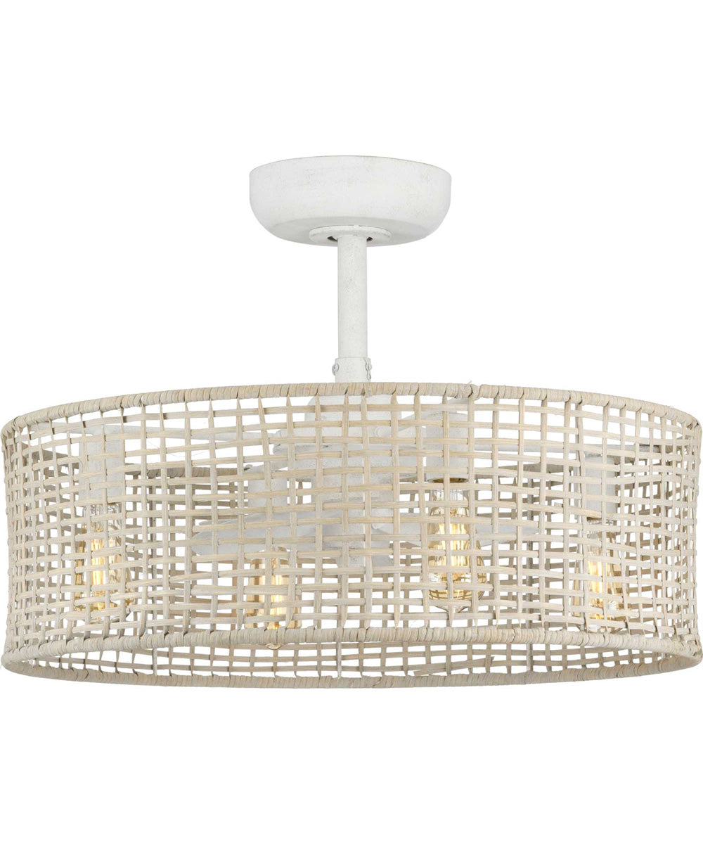 The Belva fandelier features a natural wicker frame with a charming lattice-like design that encases three cottage white blades. The hand-painted cottage white finish adds a touch of rustic elegance, while the organic, global feel of the wicker frame enhances the coastal charm of your interior decor. The round canopy shape and sleek design make it a versatile piece that can seamlessly integrate into various room themes, from farmhouse to coastal to rustic.