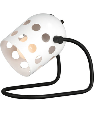 Retro configurations of Mid-Century Modern perforated metal designs inspire this collection of pendants, wall and ceiling mounts complete in a two tone powder coat finish. The spun metal shades are punched with large circular perforations that scatter a pattern of light when lit. Finished in a clean, two-tone Matte White and Black powder coat, these pieces add cheerful character to their space. The oversized shades on the wall sconce and portable lamps also feature a swivel joint that allow you to position the shade and direct the light with ease. A convenient switch on the back of the shade operates a 3-step dimmer to adjust the lamp's brightness at the touch of a button.