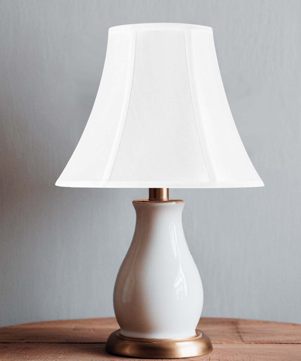 A bell-shaped lampshade has a fluted design and curved sides, similar to the shape of a bell. The gentle curves can be aesthetically pleasing. The wider bottom helps more light to spread out downwards and sideways, such as for reading or nearby activities. The smaller top helps to funnel bulb heat away from the lamp. Bell shades coordinate well with a lamp base featuring a curved surface or profile.