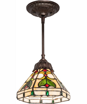 The 8" Wide Middleton Mini Pendant exudes timeless elegance with its intricate stained glass design. This stunning piece features a harmonious blend of leafy green holly, amber motifs, and ripe red berry accents, all beautifully highlighted on a creamy beige background. The shade is meticulously crafted using the renowned Meyda Tiffany copperfoil construction process, ensuring each piece is a unique work of art. The warm mahogany bronze finish adds a touch of sophistication, making this mini pendant a perfect addition to any room.