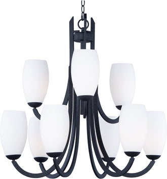 The Taylor 9-Light Chandelier in Textured Black is a stunning piece that effortlessly combines elegance and functionality. Its design features heavy rectangular tubing that supports tall-scale Satin White glass shades, creating an upscale forged look. The chandelier's textured black finish adds a touch of sophistication and modernity, making it a versatile addition to various interior styles.