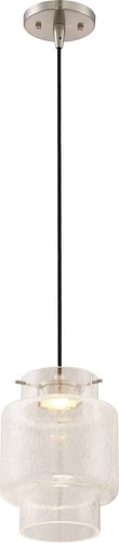 Introducing the 7"W Del 1-Light LED Pendant in Brushed Nickel by Nuvo Lighting, a stunning addition to any home or office space. This pendant light features a sleek and modern design that effortlessly complements various interior styles. The brushed nickel finish adds a touch of sophistication, while the clear crackle glass shade creates an eye-catching visual effect. The combination of these elements results in a contemporary yet timeless piece that enhances the aesthetic appeal of any room.