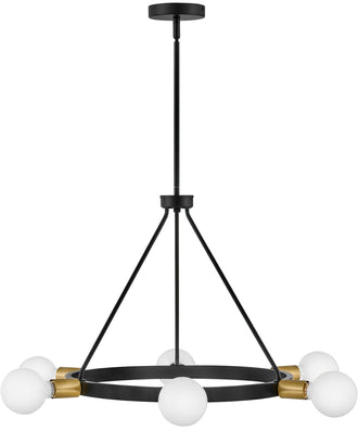 The Orla chandelier boasts a sleek black finish that exudes sophistication and elegance. Its minimalist design is complemented by lacquered brass accents, adding a touch of luxury and refinement. The chandelier's geometric shape features a central ring supported by slender rods, creating a harmonious balance between form and function. The six G-style bulbs (not included) are strategically placed around the ring, casting a warm and inviting glow throughout the room.