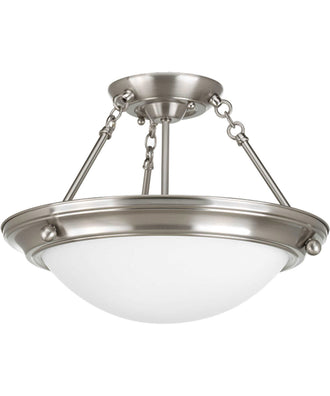 Two-light Semi-flush ceiling fixture with satin white glass is perfect for residential and commercial applications. Brushed Nickel finish.