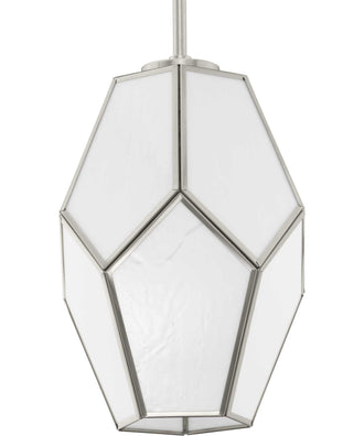 Introducing the Latham 1-Light Contemporary Pendant in Brushed Nickel, a lighting fixture that combines modern design with timeless elegance. This pendant light is part of the distinguished Latham Collection, known for its unique and artistic approach to lighting. The geometric framework of this pendant, finished in a sleek brushed nickel, showcases an array of handmade white art glass panels, creating a stunning visual effect reminiscent of an origami lantern.