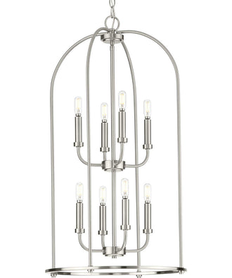 Enhance your home with the Leyden 8-Light Farmhouse Style Foyer Pendant Light in Brushed Nickel. This exquisite lighting fixture features a stunning open-frame design that adds a touch of elegance to any space. The brushed nickel finish provides a sophisticated look, making it perfect for modern and transitional decor styles. With its sleek lines and graceful curves, this pendant light is sure to become a focal point in your home.