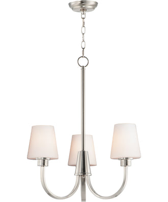 The 20"W Shelter 3-Light Chandelier in Satin Nickel is a stunning addition to any home, blending modern aesthetics with transitional design elements. The chandelier features graceful arcs of rectangular tubing that seamlessly transition into round cups, supporting tapered Satin White glass shades. This combination creates a crisp and clean look that is both sophisticated and versatile.