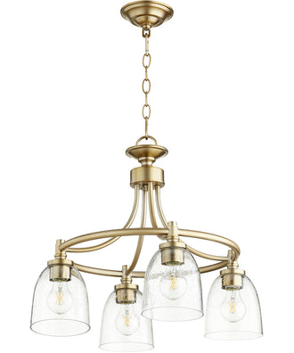 The 21" Rossington 4-light Nook Chandelier is a stunning addition to any home or office space. With its sophisticated aged brass finish, this chandelier exudes a timeless elegance that enhances the aesthetic appeal of your interior decor. The clear seeded glass shades add a touch of vintage charm, creating a perfect blend of classic and contemporary styles.