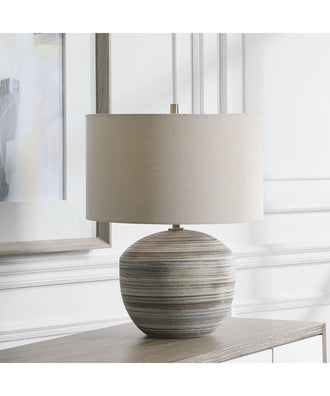 This Ceramic Accent Lamp Features A Striped Motif In Neutral Shades Of Brown, Taupe, Cream And Blue Accented By Light Brushed Brass Plated Details. A Light Beige Linen Drum Shade With Natural Slubbing Completes The Piece.Uttermost's Lamps Combine Premium Quality Materials With Unique High-style Design.With The Advanced Product Engineering And Packaging Reinforcement, Uttermost Maintains Some Of The Lowest Damage Rates In The Industry. Each Product Is Designed, Manufactured And Packaged With Shipping In Mind.