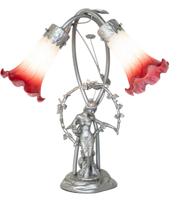 The 16" High Pink/White Tiffany Pond Lily 2 Light Trellis Girl Accent Lamp is a stunning piece of art that combines elegance and functionality. This handcrafted lamp features a delicate zinc base material, intricately designed to resemble a trellis with a graceful girl figure entwined in its vines. The base is finished in a light sandstone color, adding a touch of sophistication to any room.